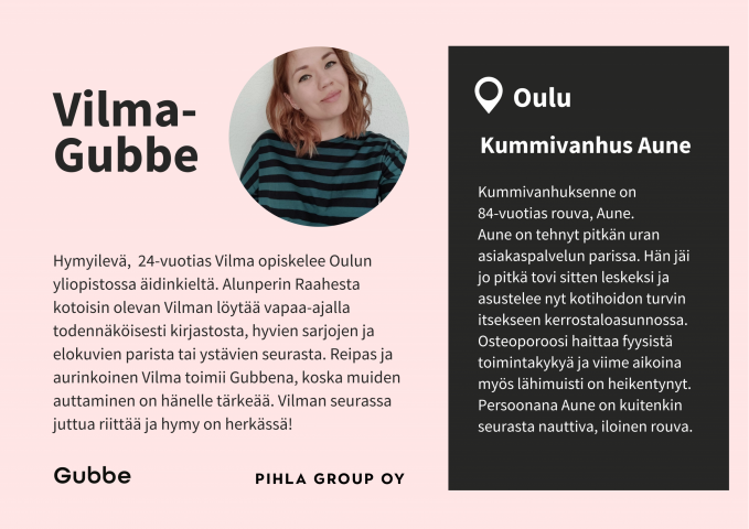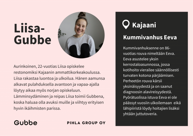 Olemme erittäin onnellisia, että voimme Gubben kautta mahdollistaa näin lämpimät ja arvokkaat kohtaamiset kummivanhuksillemme ja tarjota Liisalle ja Vilmalle erityisen tärkeän työtehtävän. Toivomme heille yrityksemme puolesta sydämellisiä seuraavia kohtaamisia ja jäämme ilolla odottamaan joulukuun terveisiä.