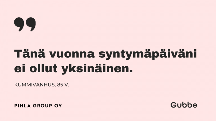 Olemme erittäin onnellisia, että voimme Gubben kautta mahdollistaa näin lämpimät ja arvokkaat kohtaamiset kummivanhuksillemme Eevalle sekä Aunelle ja samalla tarjota Liisalle ja Vilmalle erityisen tärkeän työtehtävän. Toivomme heille yrityksemme puolesta jatkossakin sydämellisiä kohtaamisia ja jäämme odottamaan heidän helmikuun kuulumisiaan.