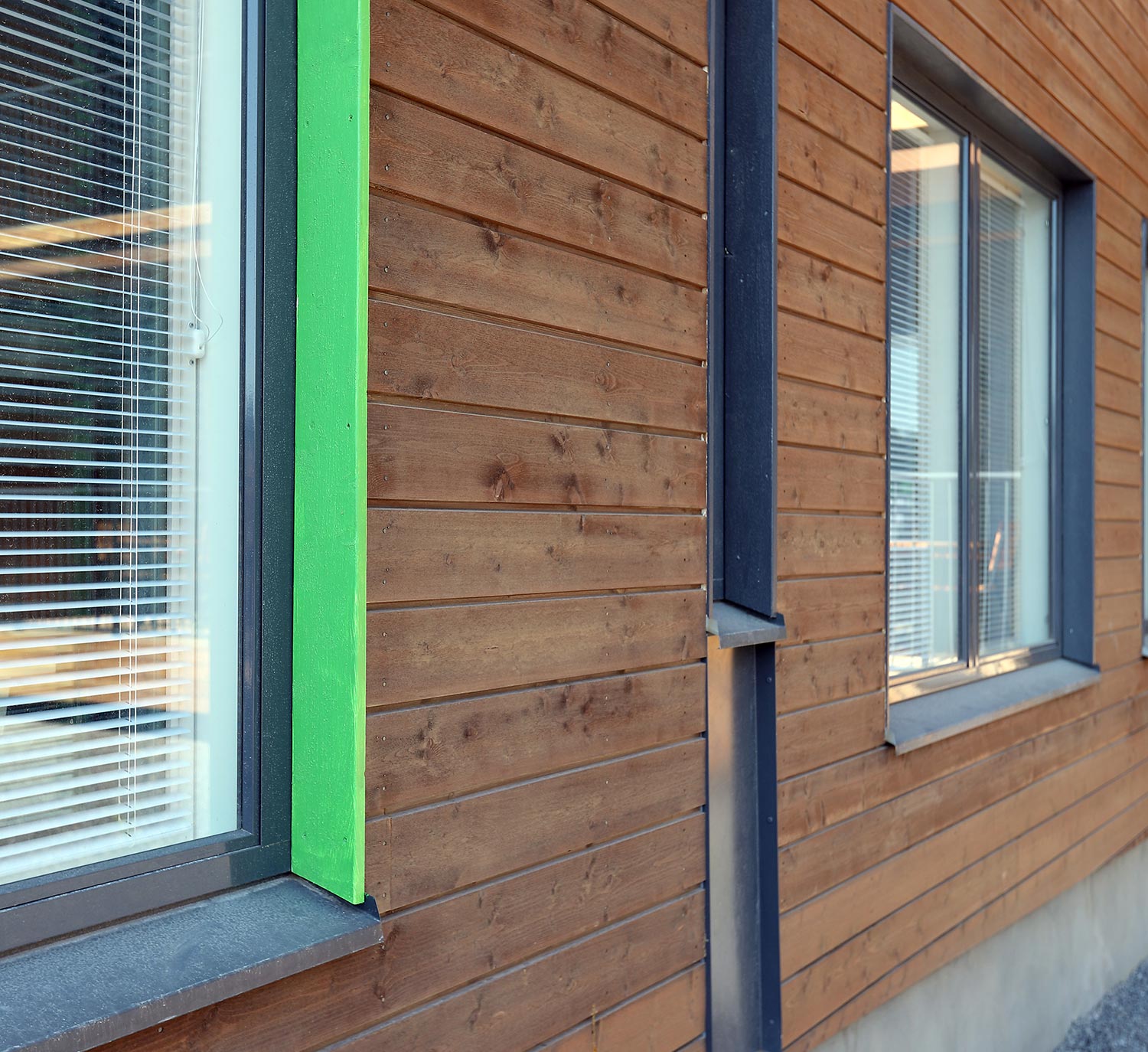 Puuverhoilu, isot ikkunat sekä kirkkaan keltaiset ja vihreät ikkunalaudat tekevät kaksikerroksisesta modernista palvelutalosta ilmeikkään.