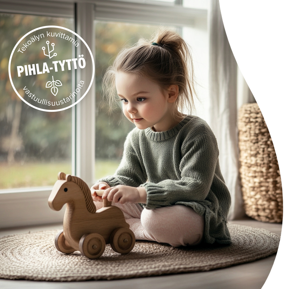 Äiti taputti hevosen puista selkää ja hymyili. ”Tämä lelu on kestänyt näin kauan, koska se on tehty huolellisesti ja laadukkaista materiaaleista. Ja tiedätkö mitä? Tämä on taidettu tehdä ihan suomalaisesta puusta. Samanlaisesta, joita kasvaa tuossa meidän mustikkametsässäkin.”