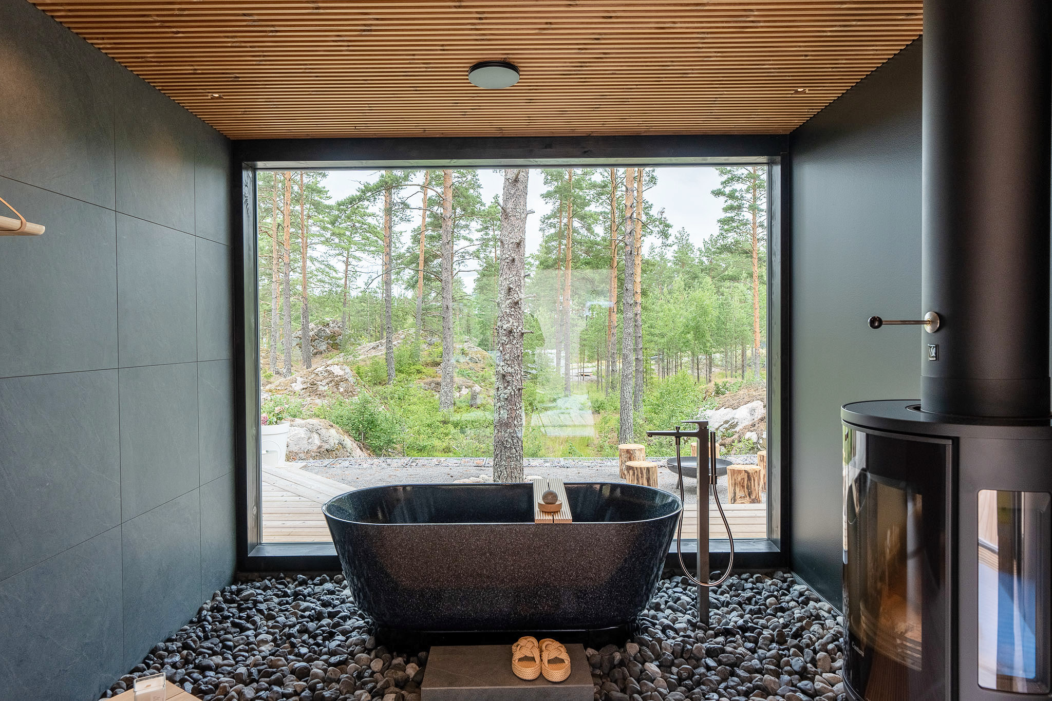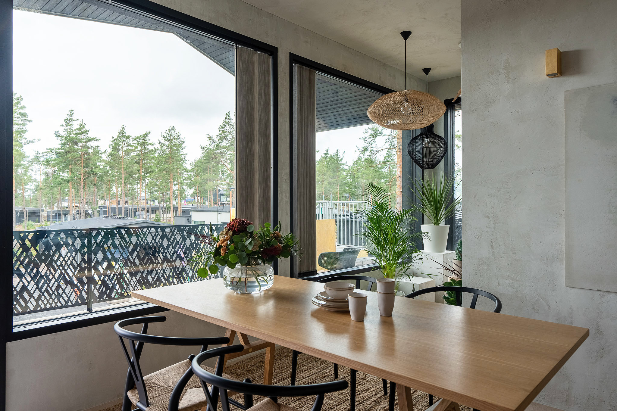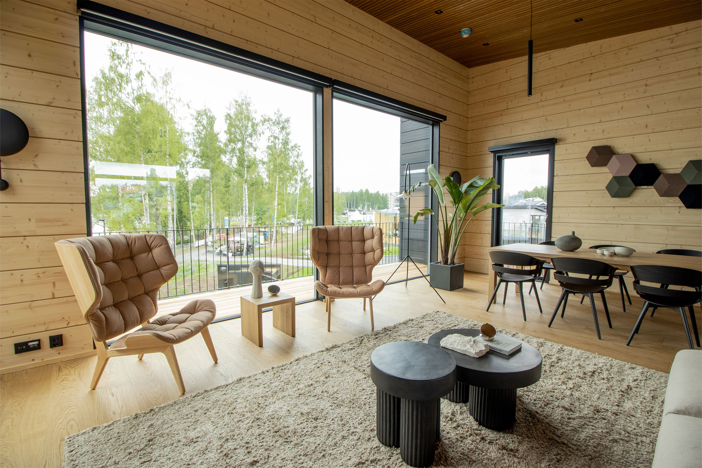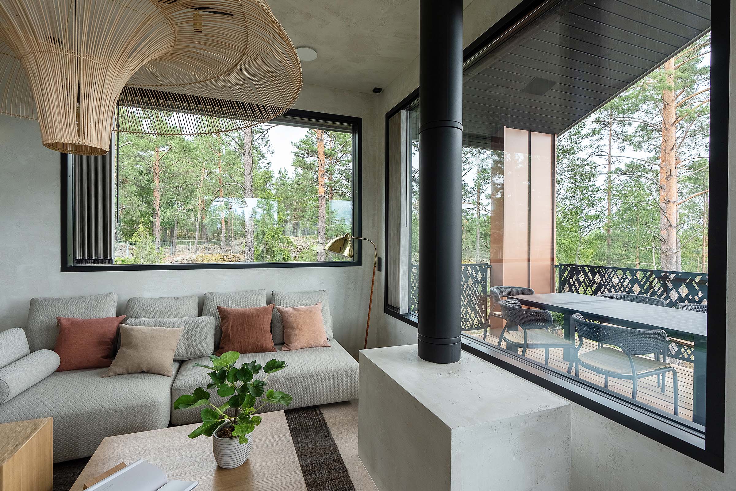 Suuret lasipinnat saavat luonnonvalon ja maiseman tulvimaan sisätiloihin