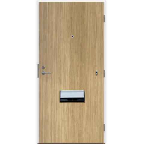 valkoiseksi maalattu karmi ja tammikynnys koottuna, murtosuojatut säädettävät saranat, lukkorunko ilman pintaheloja sekä lukon vastarauta.