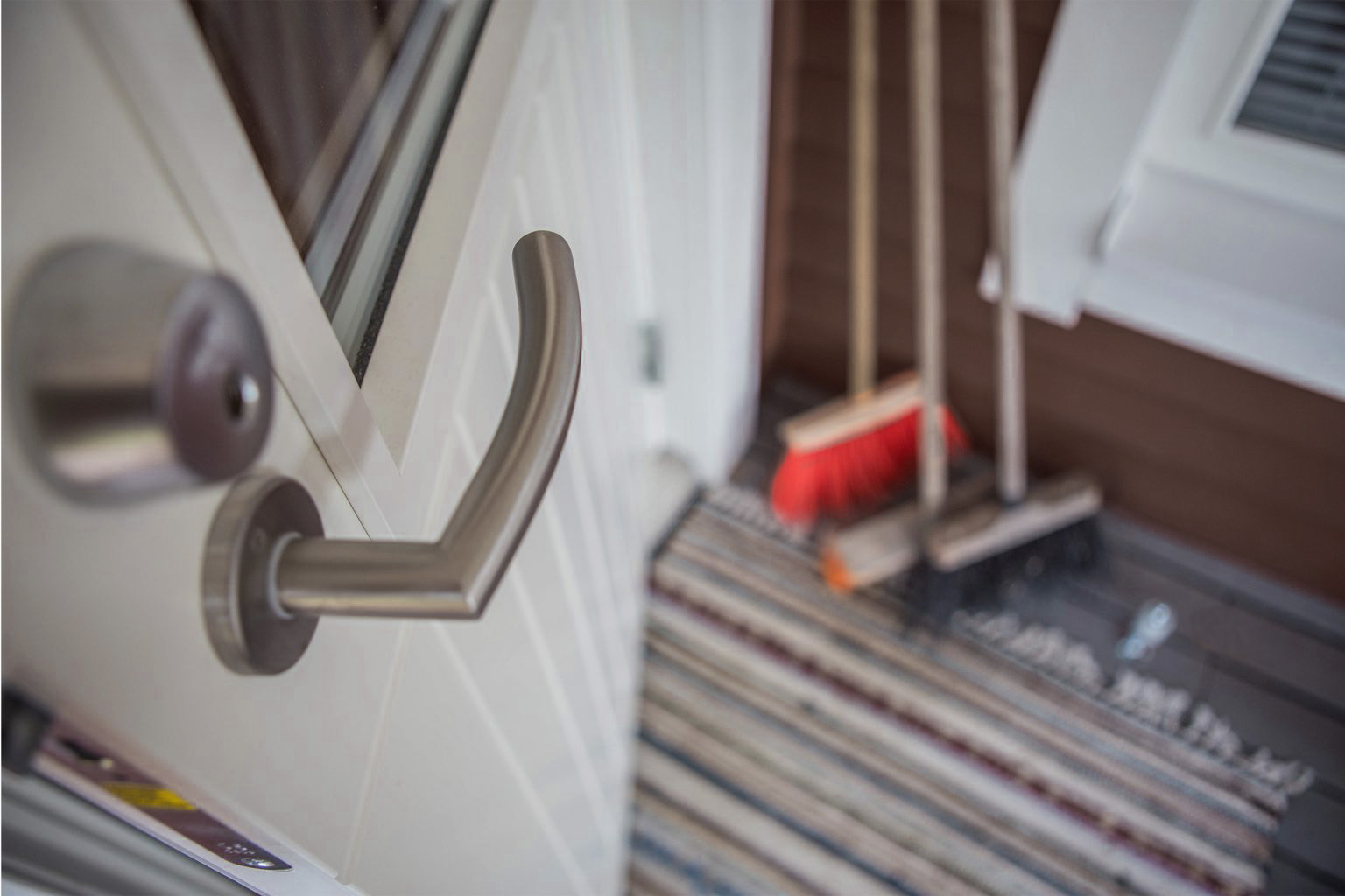 Lisäksi mökkioven värin voi valita lukuisista vaihtoehdoista. Myös painikkeiden tyyli ja väritys tarjoaa valinnanvaraa. Lisävalintoina mökkioviin löytyy myös esimerkiksi älylukitus, ovipumppu tai tyylikäs ovivalo.