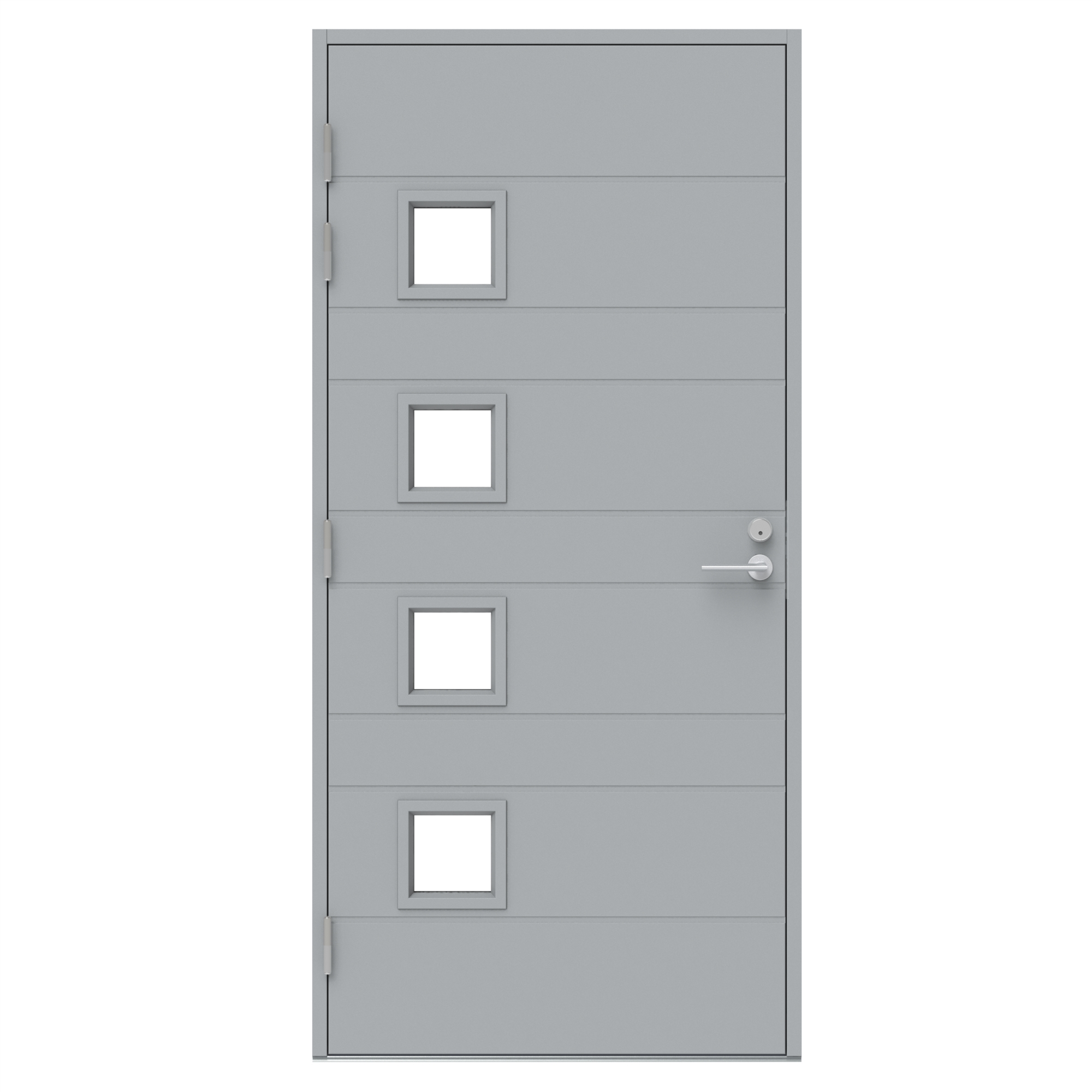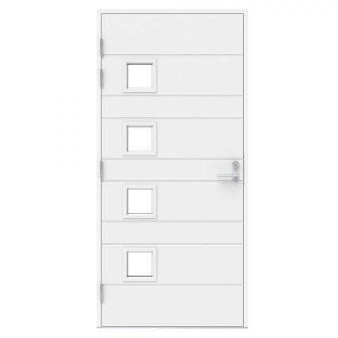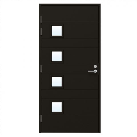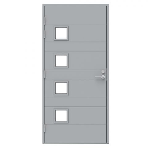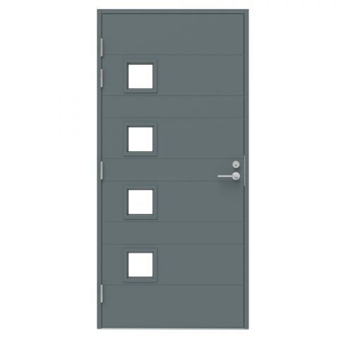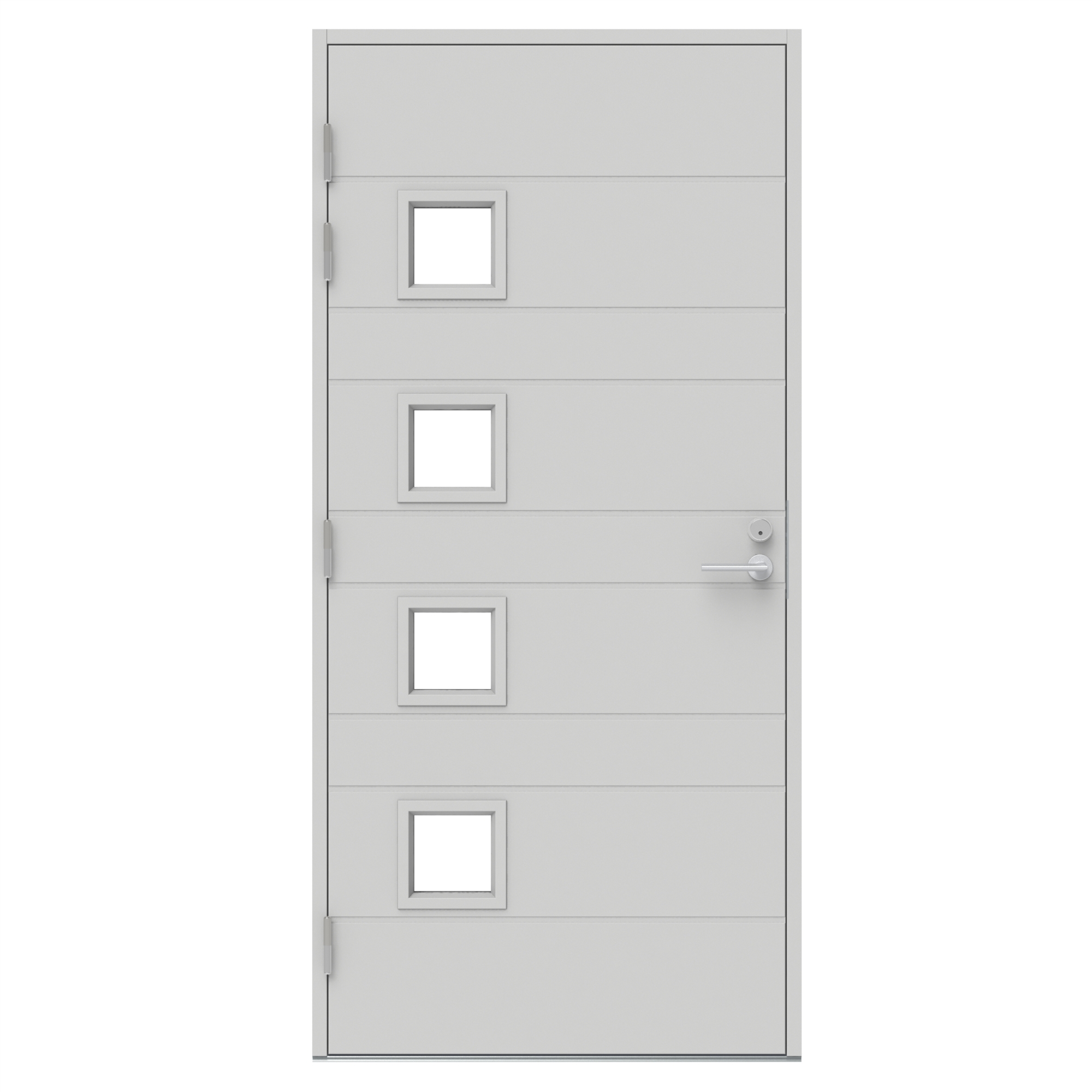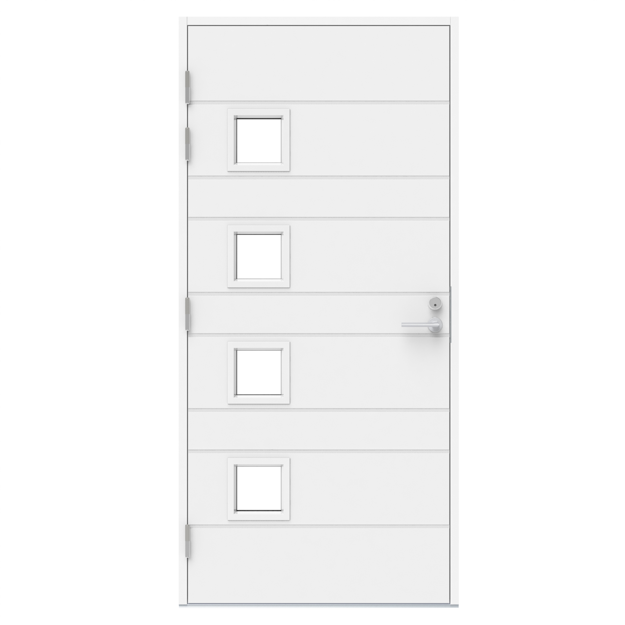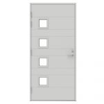Suunnittele omasiModerni levikkeellinen ulko-ovi, jolle tuovat ilmettä neljä neliön mallista ikkunaa, sekä oven levyiset vaakauritukset. Ovi on saatavilla useissa eri väreissä. Oven rakenne on valittavissa Varma-rakenteella tai energiatehokkaalla Termo-rakenteella.