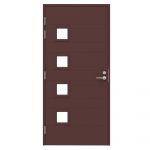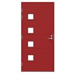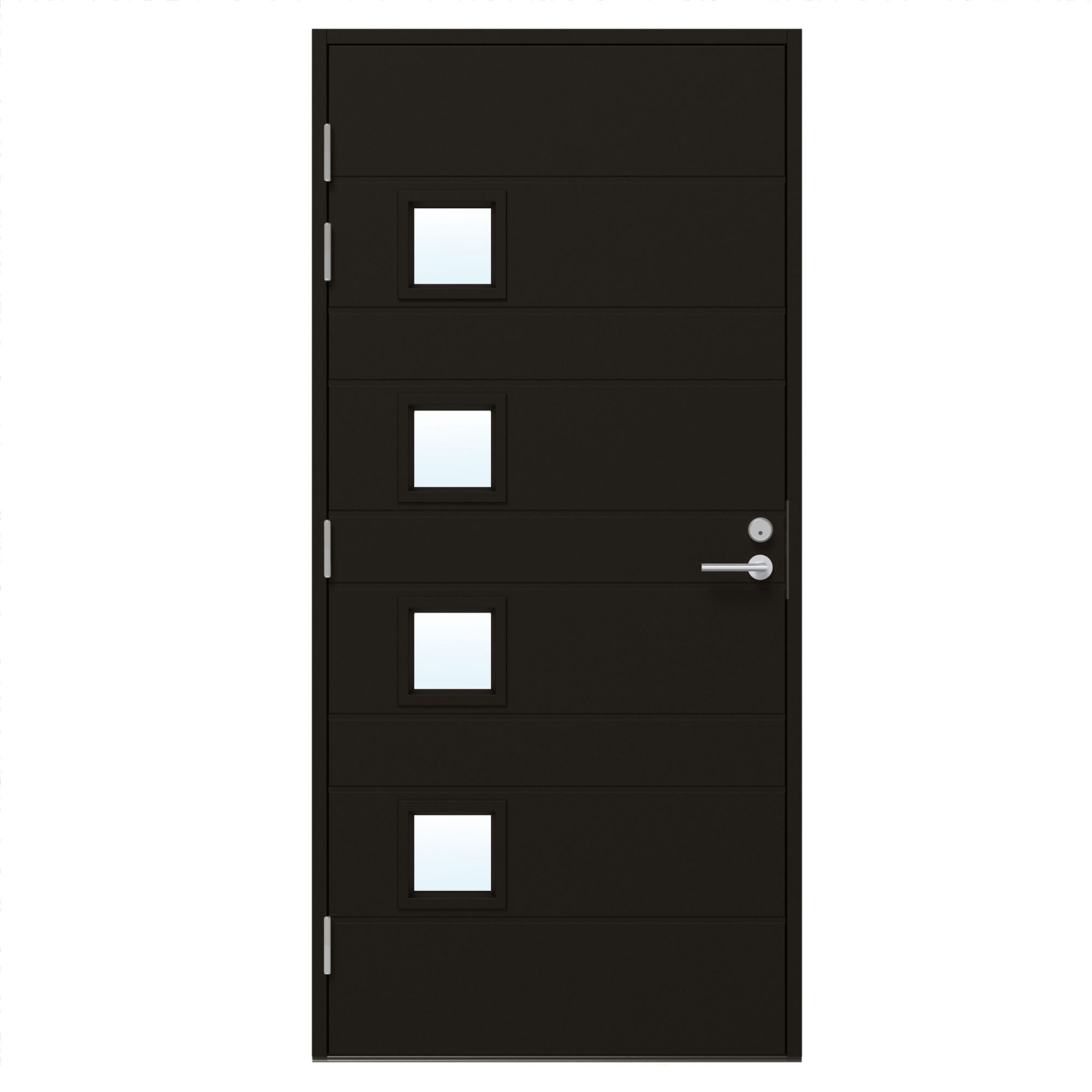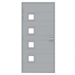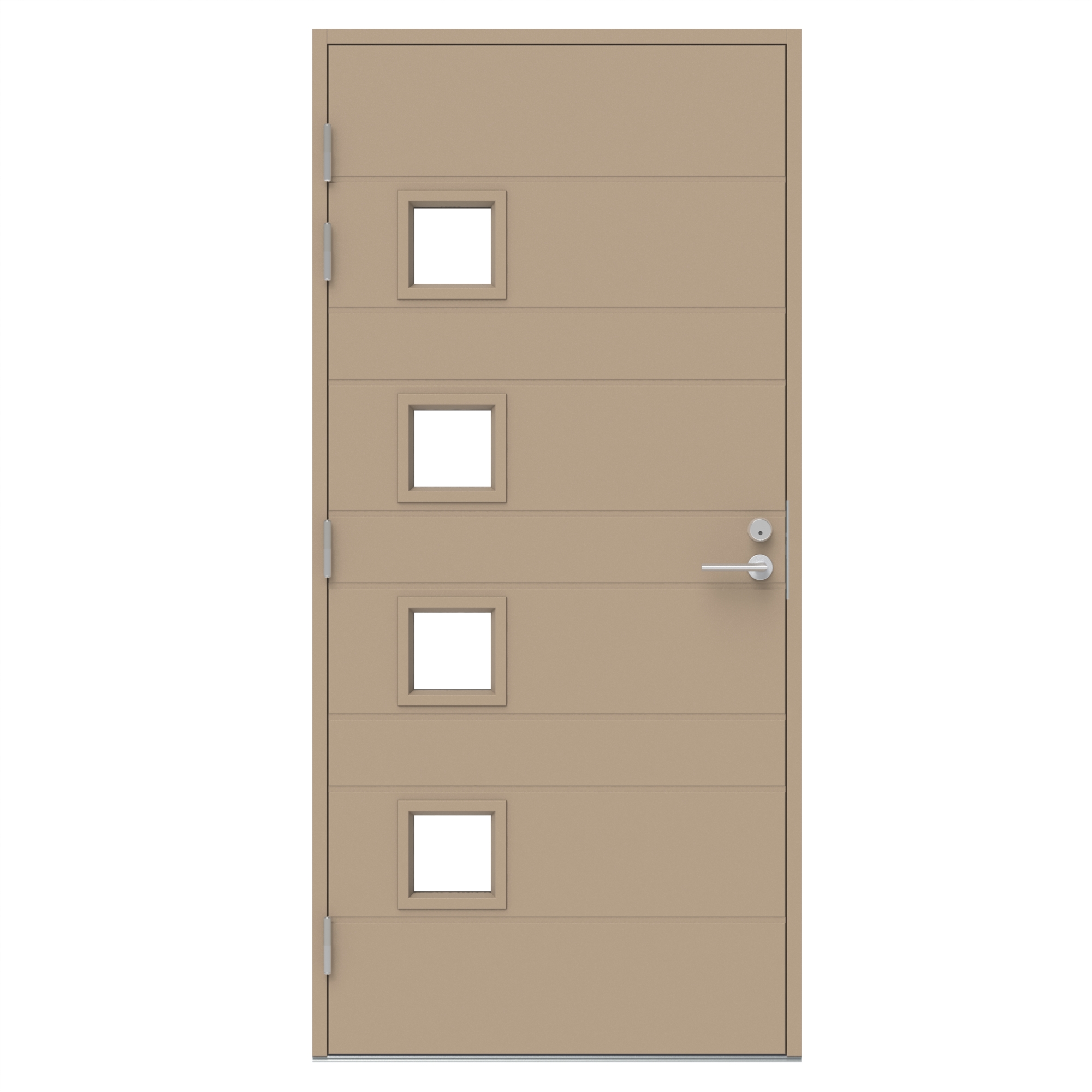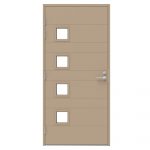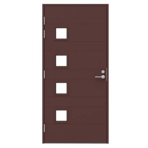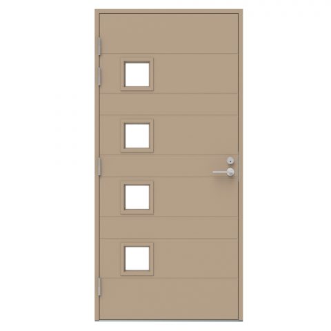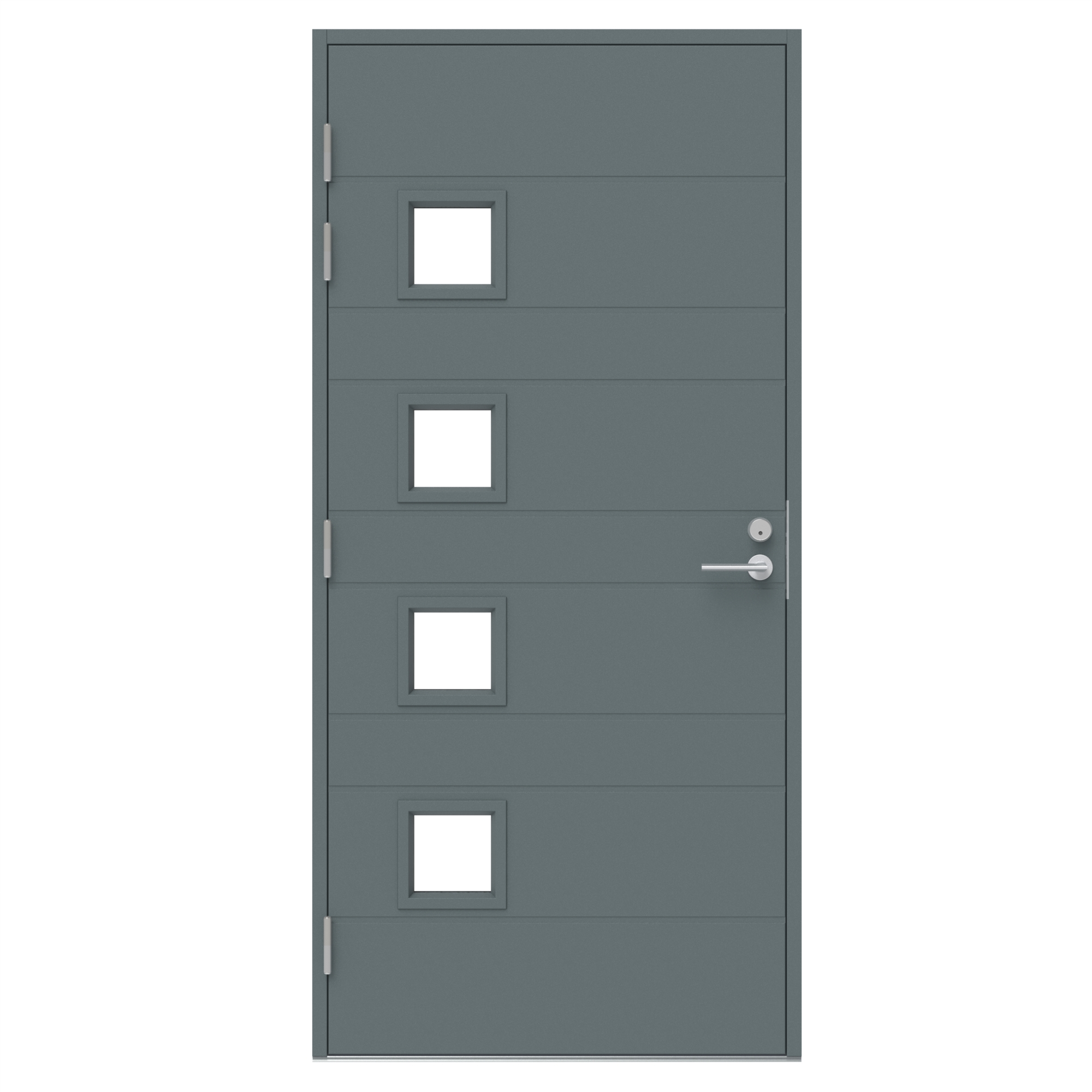 Suunnittele omasiModerni levikkeellinen ulko-ovi, jolle tuovat ilmettä neljä neliön mallista ikkunaa, sekä oven levyiset vaakauritukset. Ovi on saatavilla useissa eri väreissä. Oven rakenne on valittavissa Varma-rakenteella tai energiatehokkaalla Termo-rakenteella.
