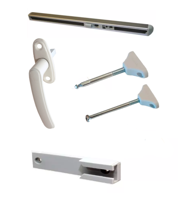 Autolock välisulkimen, kouruliu’un ja ikkunan sisäpuitteen painikkeen mukana toimitetaan ruuvit kiinnitystä varten. Ala- ja ylätukipultit eivät sisällä kiinnitystarvikkeita. Tuuletusikkuna avataan 2 – 5 :llä sisäpuitteen kiintopainikkeella, joita sarjaan kuuluu 3 kappaletta. Sisäpuitteen painikkeita saa tarvittaessa tilattua yksittäin lisää.