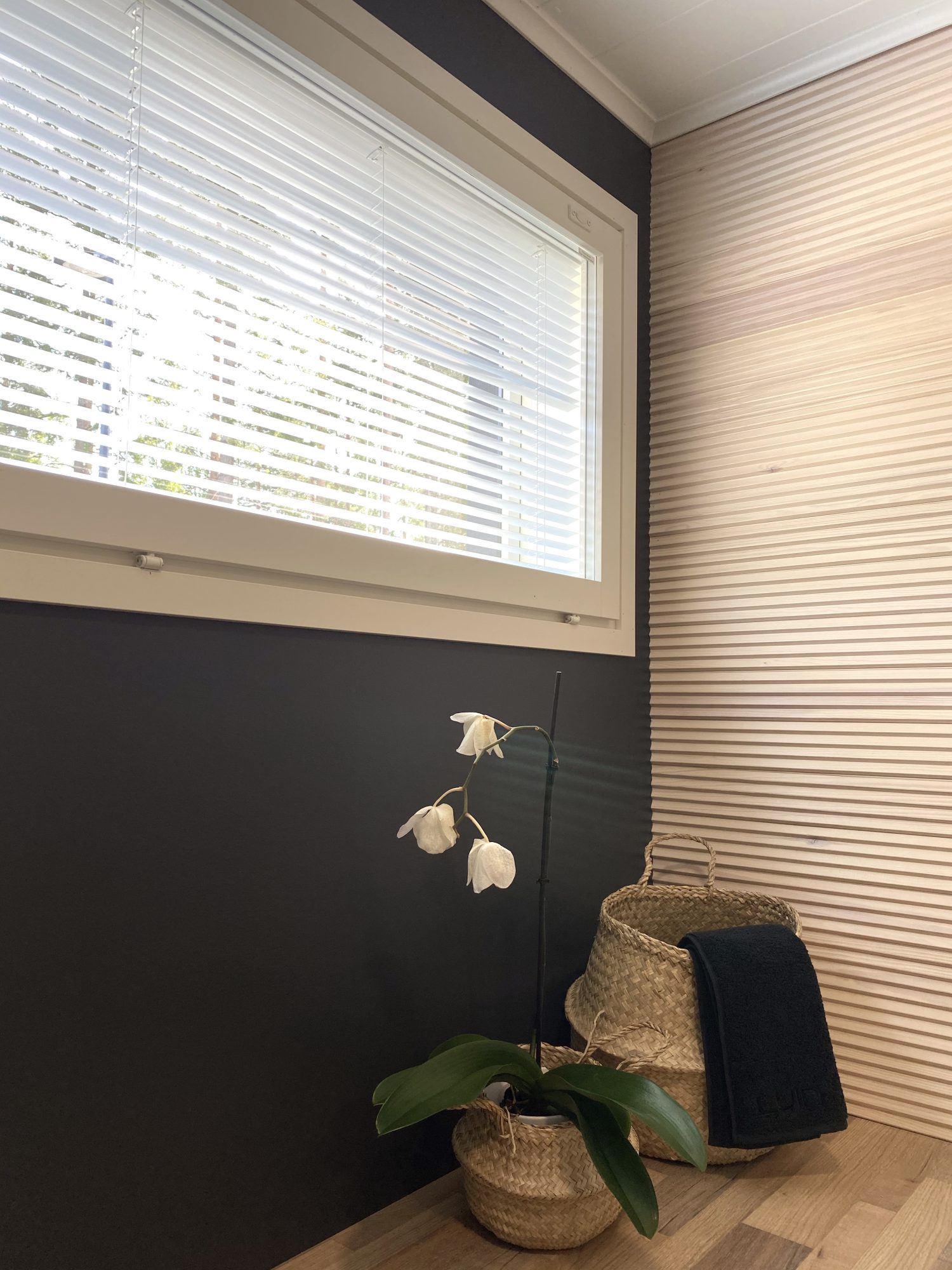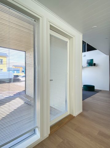 Dekotalo Ruudin yläkerrassa nukutaan ja rentoudutaan. Valoa riittää makuuhuoneisiin eri ilmansuuntiin avautuvien isojen Pihlan ikkunoiden ja makuuhuoneen lasiseinän ansiosta. Ranskalainen parveke Pihlan parvekeovella varustettuna on kaunis ja käytännöllinen yksityiskohta. Makuuhuoneiden ja kylpytilojen Pihla Varma-malliston avattaviin ikkunoihin tuli toimituksen mukana sälekaihtimet, joiden avulla voi huoneen valoisuutta voi säätää ja samalla rajoittaa suoraa auringon paistetta sisätiloihin. Lisäksi sälekaihtimia voidaan käyttää näkösuojana. Sälekaihtimet on vaivattominta hankkia ikkunatoimituksen yhteydessä, jolloin ne asennetaan ikkunaan jo tehtaalla. Vakioväri valkoisen lisäksi muita värivaihtoehtoja on saatavilla useita kymmeniä.