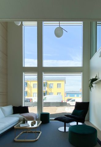 Suunnittelussa on huomioitu helpon yhdessäolon lisäksi mahdollisuus rauhoittumiseen ja tilojen soveltuminen monenlaiseen sisustukseen. Talon sisätiloissa toistuu julkisivun musta värimaailma, jota on kevennetty luonnonläheisillä sävyillä. Dekotalo Ruudin asukkaille tärkeänä osana talon suunnittelussa ovat avaruus, valoisuus ja tilantuntu. Sisätilojen sydän on korkea olohuone, johon talon muut tilat liittyvät ja avautuvat. Olohuone on täyskorkea ja isot Pihla Varma kiinteät ikkunat kohoavat lattiasta kattoon. Talon asukkaille alakerran yhteistilat ovatkin erityisen mieluisia; ”Pidämme olohuone- ja ruokailutilan ikkunoiden luomasta tunnelmasta. Ruokailutilasta aukeaa rauhallinen metsämäinen näkymä, johon ihastuimme välittömästi. Olohuoneen korkeat ikkunat tuovat talolle tilantuntua ja mahdollistavat valoisan tunnelman myös yläkertaan”, kertoo Julia Pärssinen.