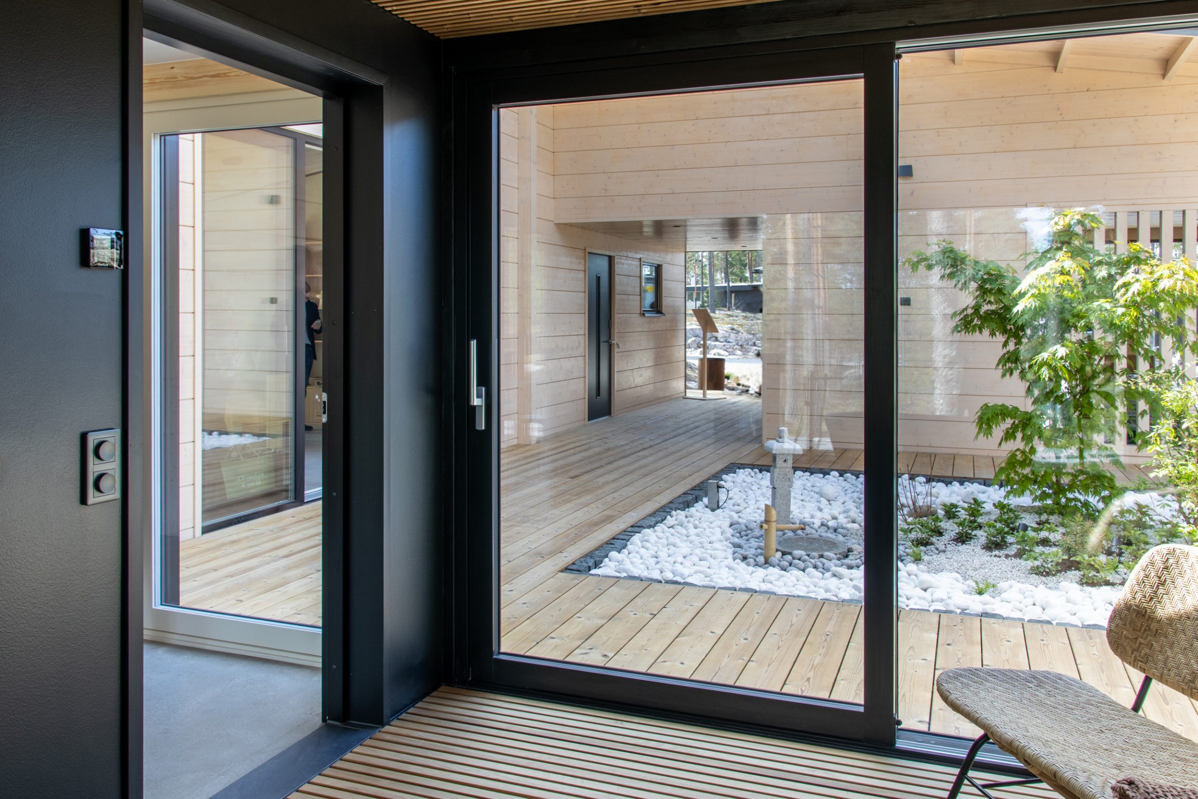 Haikun keskiössä on talon atriumpiha, joka aukeaa ympäri taloa upeista Pihlan tarjoamista Profin-lasiliukuovista. Lasiliukuovet eivät vain avaa sisätiloja atriumpihallle, mutta myös takapihan metsään, jonne on näkymä läpi talon suoraan atriumpihalta. Lasiliukuovet mahdollistavat sisätilojen maksimaalisen luonnonvalon määrän, mutta myös upeat maisemat ulos. Profinin liukuovet ovat markkinoiden tiiveimpiä ja tiiveydeltään, sekä energiatehokkuudeltaan ne vastaavat täysin tavallisia ulko-ovia. Yhdessä kiinteän ikkunan ikkunan kanssa lasiliukuovesta voidaan muodostaa vaikuttava lasiliukuseinä.