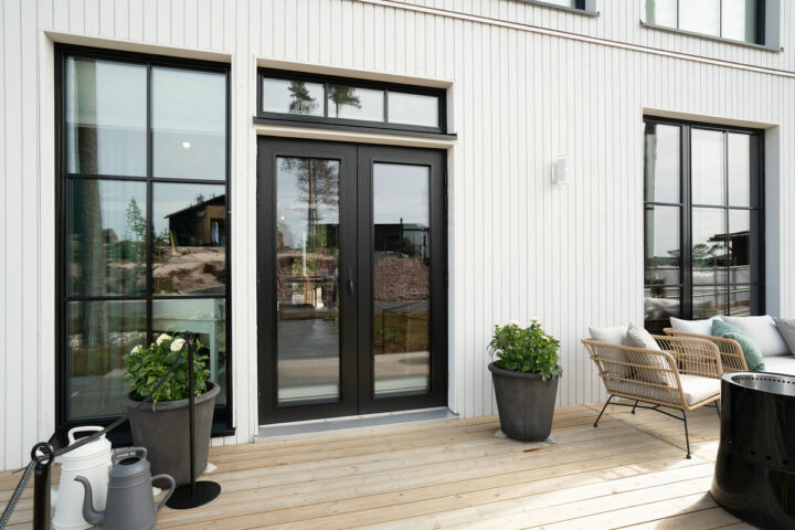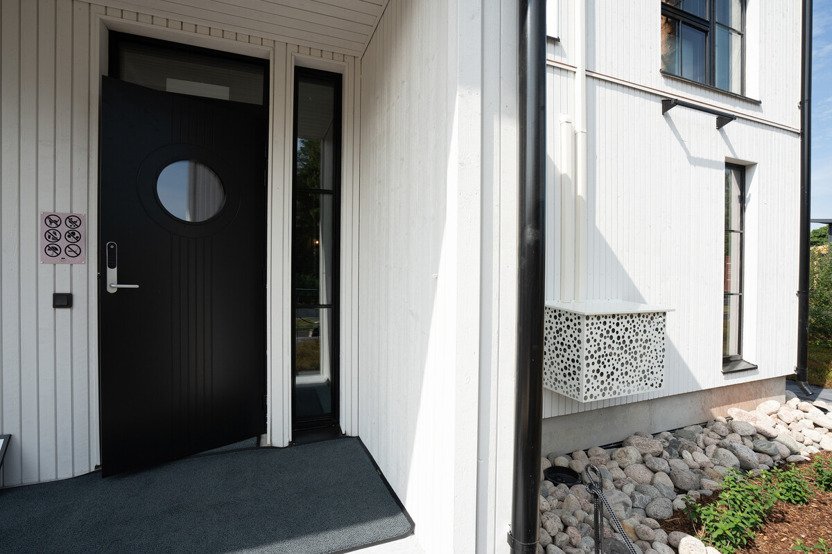 Kaikissa kohteen ovissa on mustat yksityiskohdat niin avainpesien, painikkeidenkin, kuin saranoidenkin osalta. Pääoveen on lisäksi valittu arkea helpottava Yale Doorman -älylukitus, joka mahdollistaa avaimettoman kulkemisen ja perheen pienimpien kohdallakaan ei tarvitse tällöin huolehtia kotiavainten hukkumisesta.