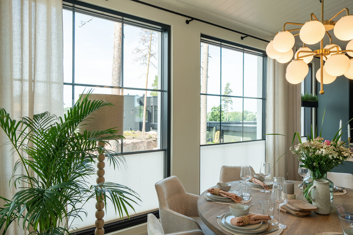 Asuntomessukohteeseen on valittu ikkunoiksi Pihlan Termo BLACK-ikkunoita, Varma kiinteitä ja avattavia ikkunoita, sekä kiinteitä paloikkunoita. Oviksi Pihlan valikoimasta on valikoitunut umpiovina Pihla palo-ovi, sekä Varma ulko-ovi, Takapihaovi yksittäisenä ja pariovena, sekä pääoveksi valittu Varma Suosikki-malliston ulko-ovi S32. Kaikki kohteeseen valitut ovet ovat myös väritykseltään mustia.