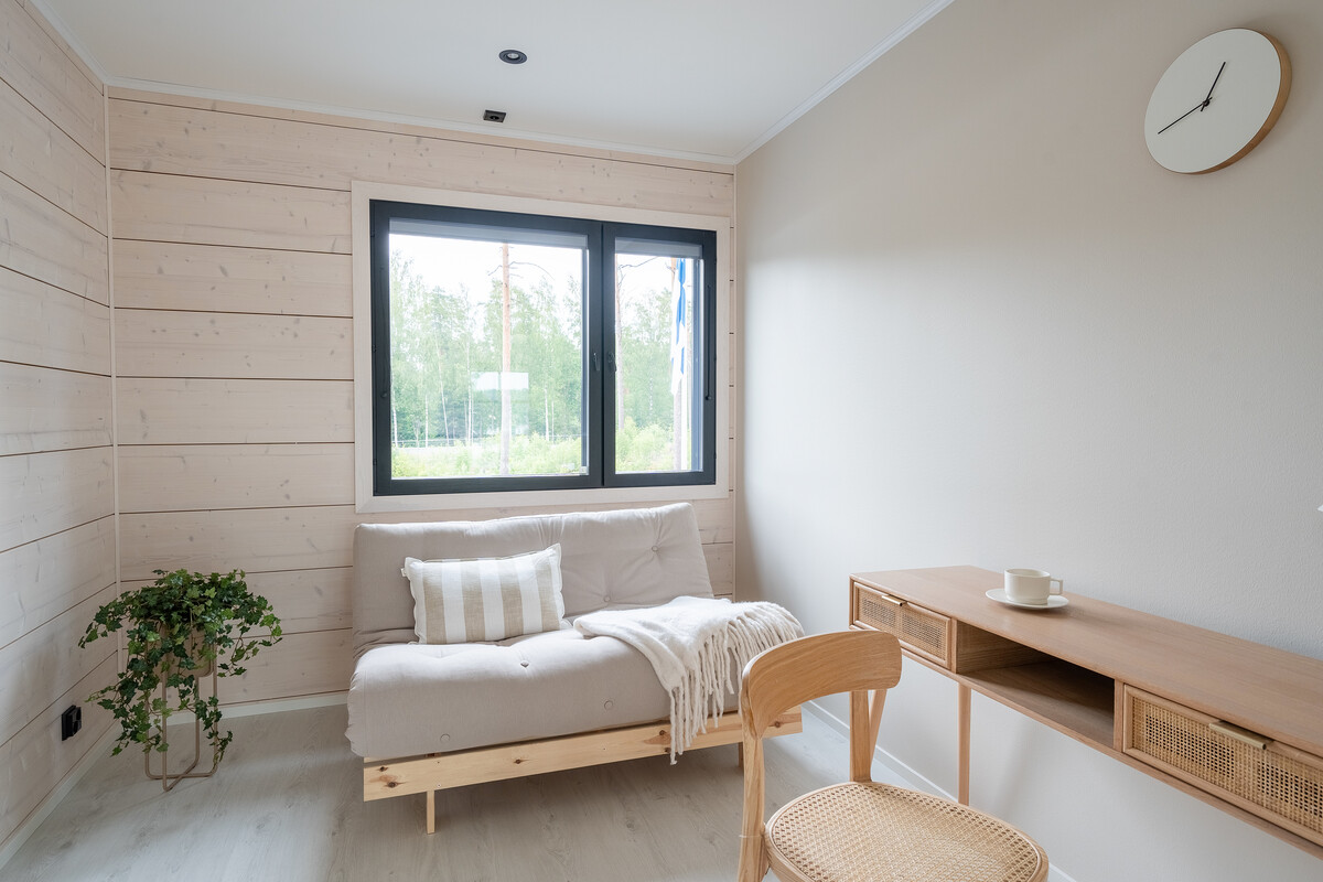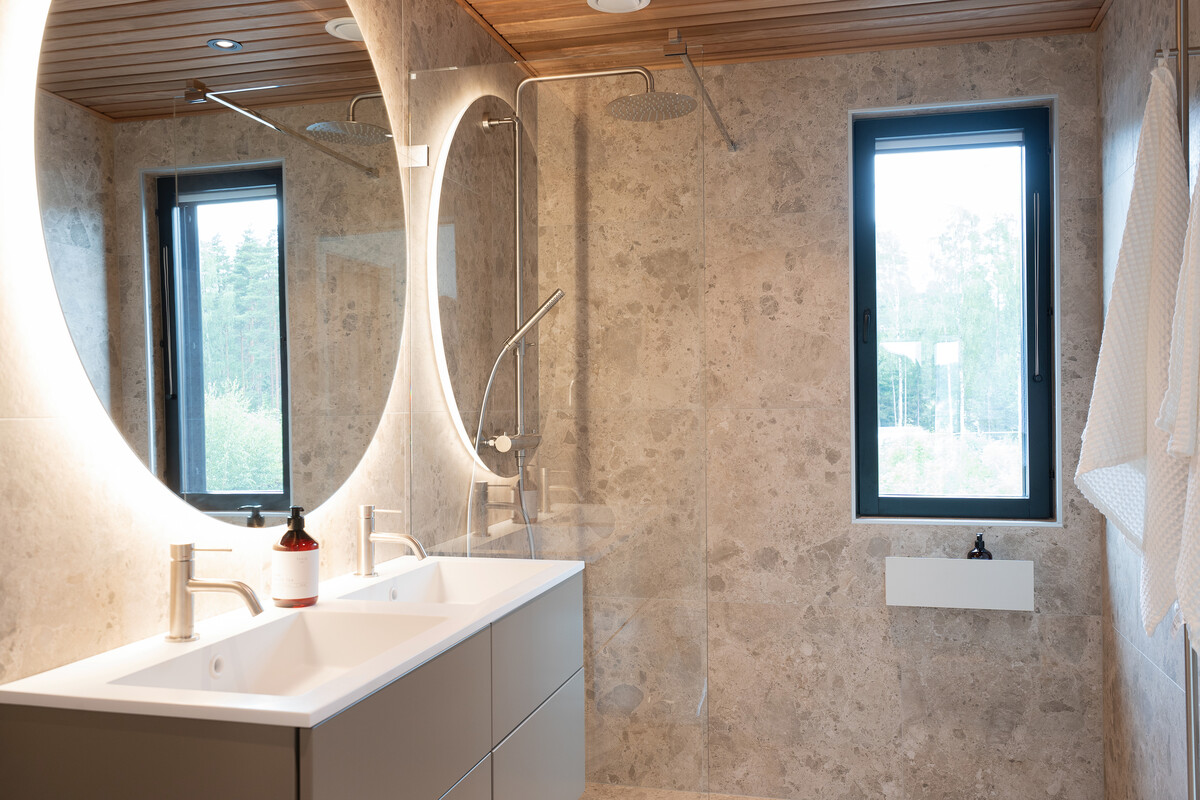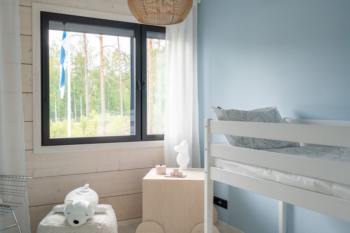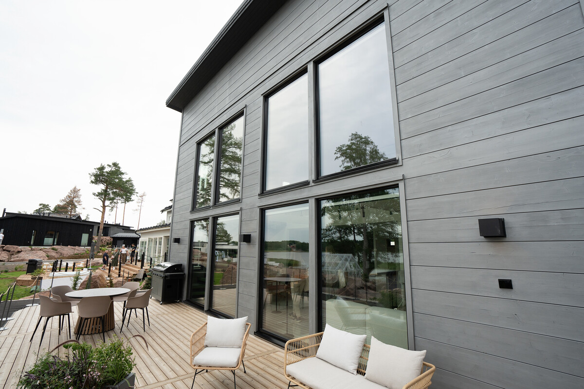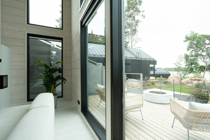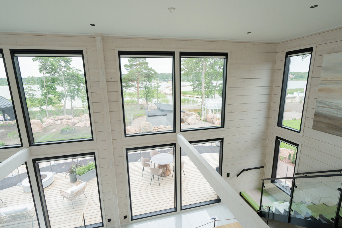 Kohteeseen on valittu mustan värisiä Pihla Varma-rakenteisia avattavia, sekä kiinteitä ikkunoita. Yläkerran pienempiin makuuhuoneisiin on valikoitu kaksiruutuiset ikkunat, joissa toinen osa on avattava. Tämä mahdollistaa turvallisen tuuletuksen ja nopean ilman raikastamisen. Päämakuuhuone suuntautuu talon sivulle ja tilaan onkin valittu suuri kiinteä ikkuna, joka tuo ympäröivän maiseman upeasti osaksi makuuhuoneen sisustusta, sekä pariksi kapeampi avattava ikkuna, johon on sisällytetty myös hätäpoistumistie.