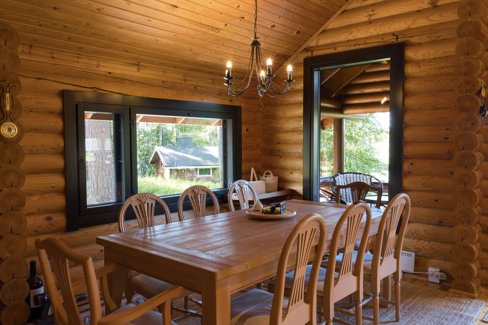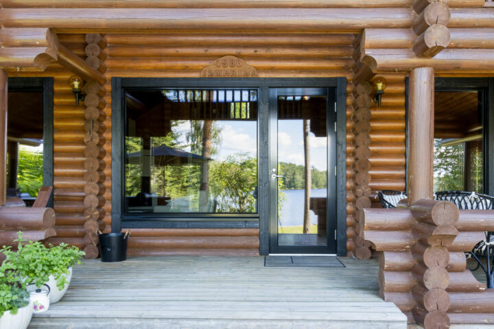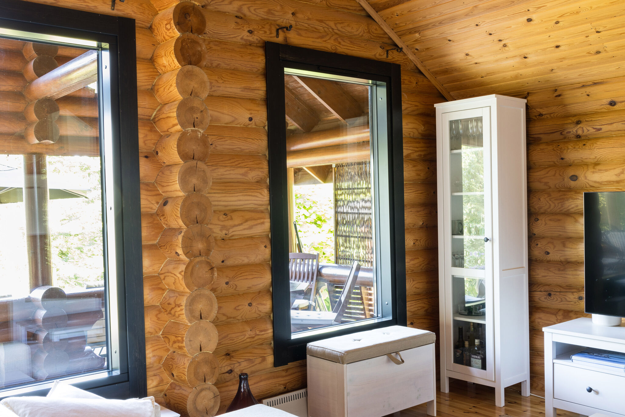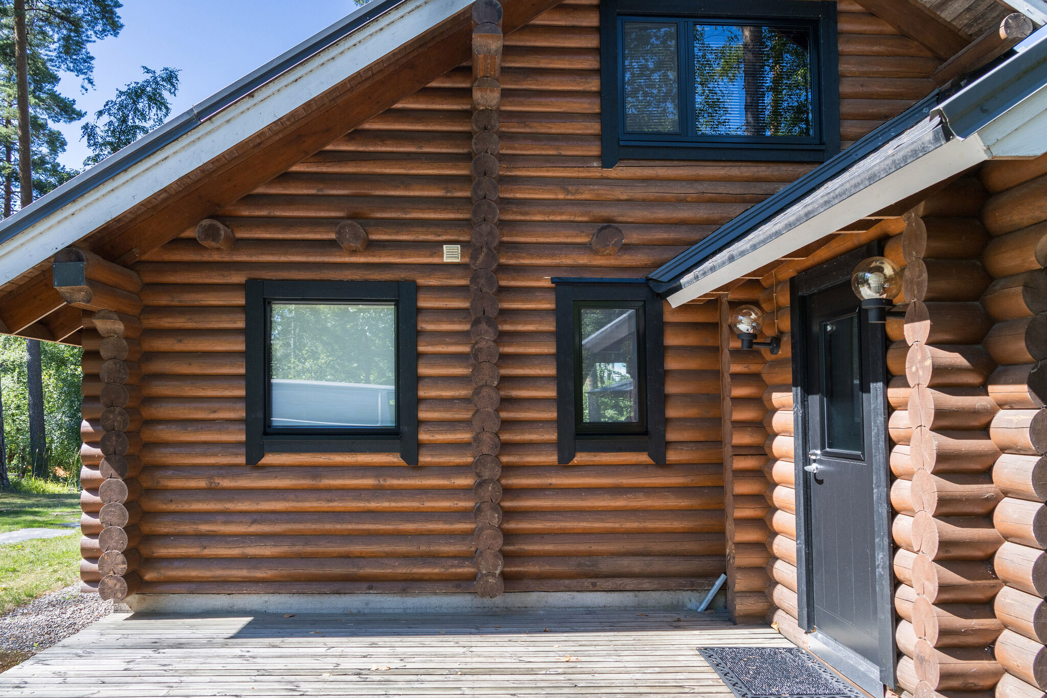 Järvenrannalla sijaitseva pyöröhirsimökki on hyvin pidetty ja kaikesta huomaa, että siellä viihdytään. Ikkuna- ja oviremontin tarkoituksena oli parantaa talon lämpötaloutta ja sitä kautta mahdollistaa mökin aktiivinen käyttö myös kesäkauden ulkopuolella. Lisäksi toiveena oli saada sisätiloihin enemmän luonnonvaloa.