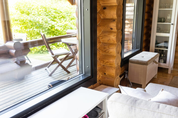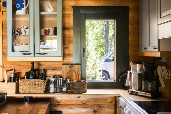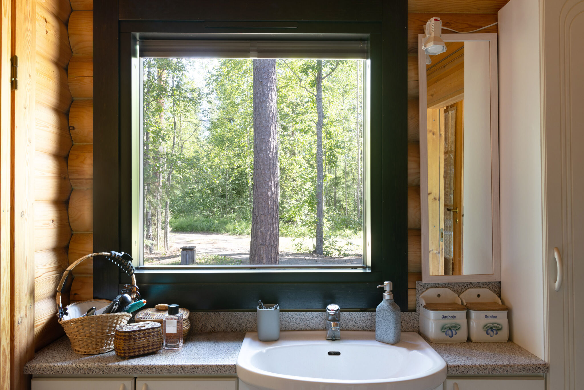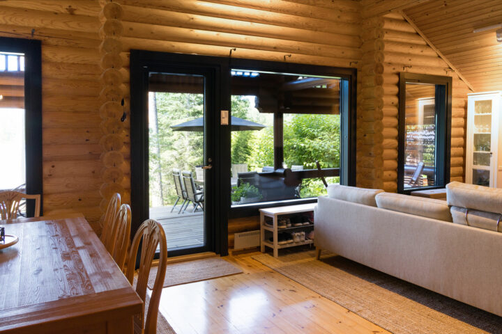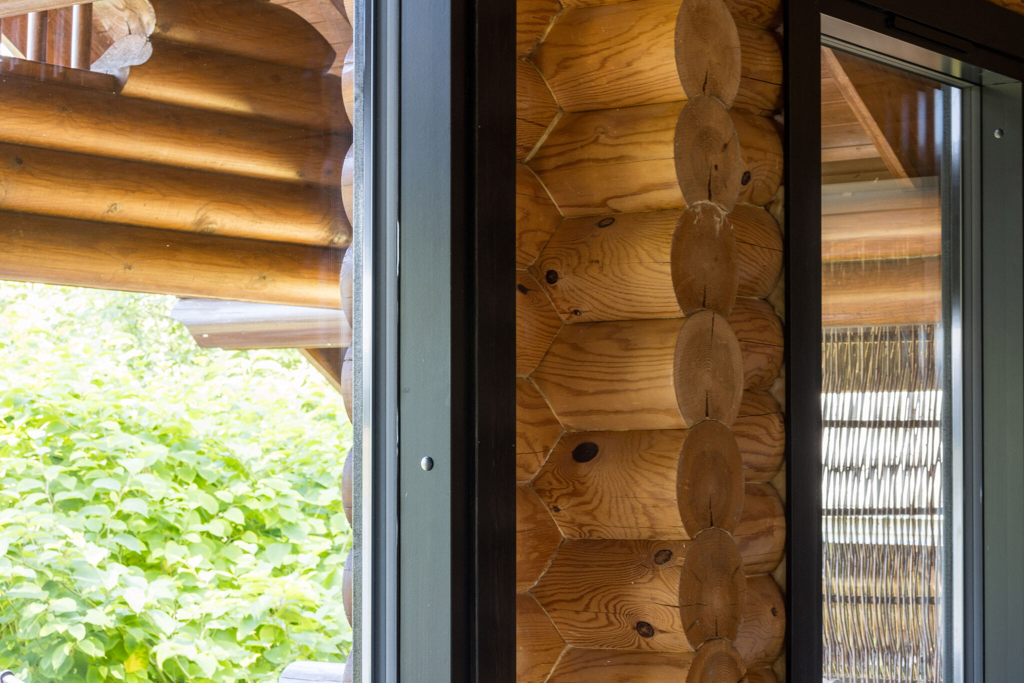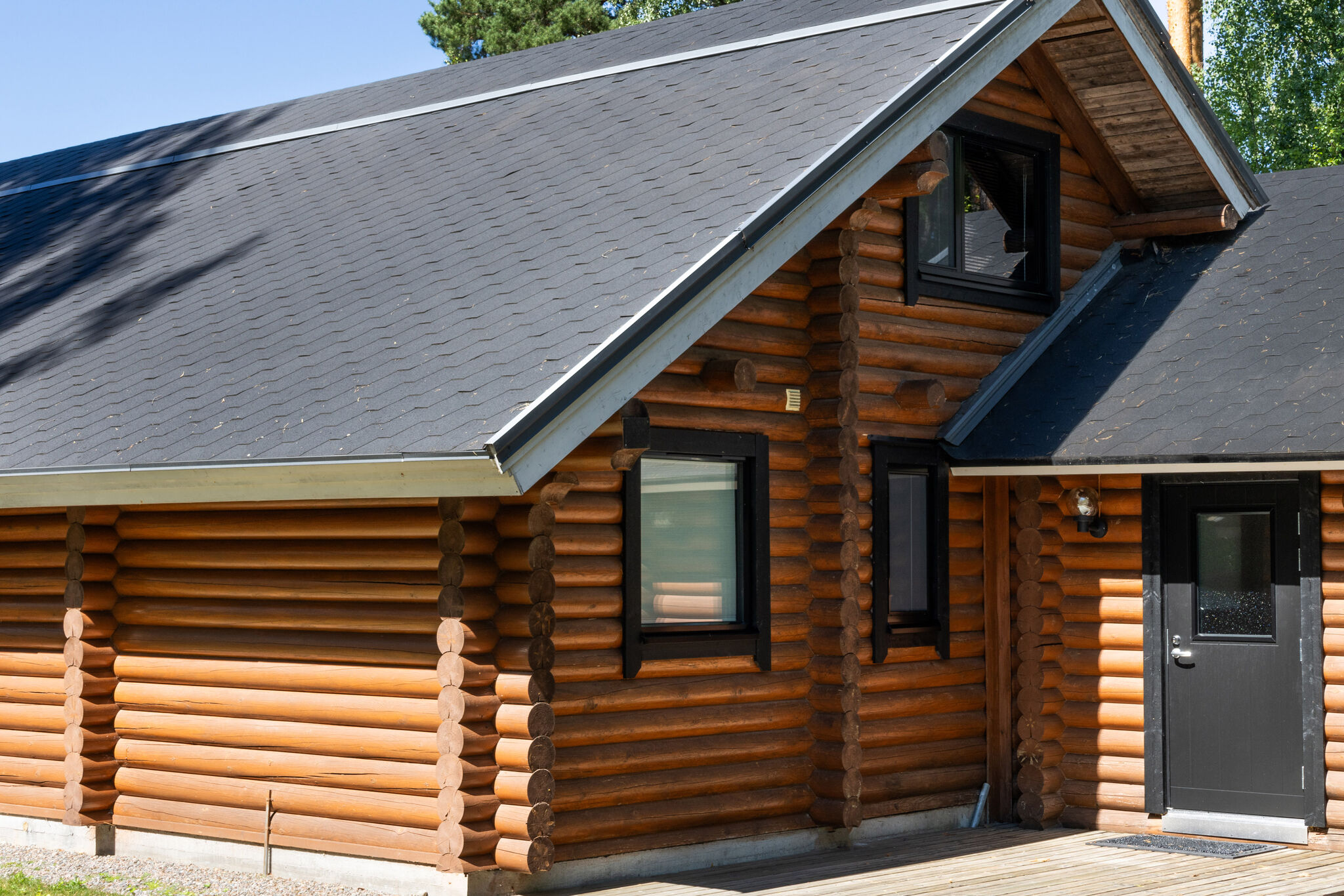 Järvenrannalla sijaitseva pyöröhirsimökki on hyvin pidetty ja kaikesta huomaa, että siellä viihdytään. Ikkuna- ja oviremontin tarkoituksena oli parantaa talon lämpötaloutta ja sitä kautta mahdollistaa mökin aktiivinen käyttö myös kesäkauden ulkopuolella. Lisäksi toiveena oli saada sisätiloihin enemmän luonnonvaloa.