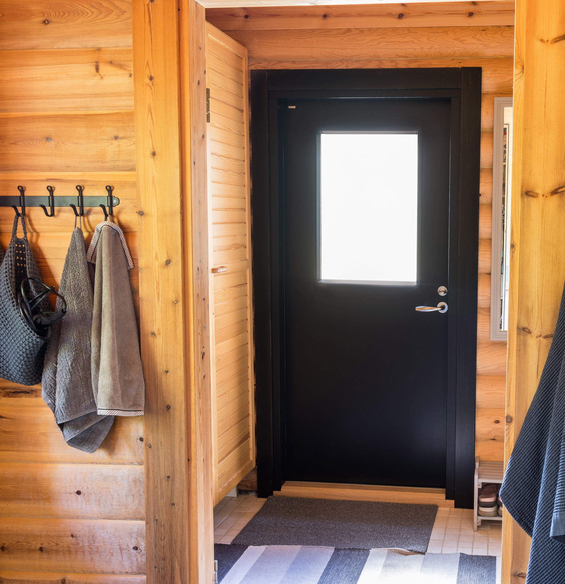 Pääoveksi valittiin musta kokolasinen Patio-ovi valon maksimoimiseksi. Molemmin puolin musta takaovi on Suosikki-malliston S23. Takaoven lasiaukosta jätettiin ristikko pois ja valittiin Stippolyte-näkösuojalasi.