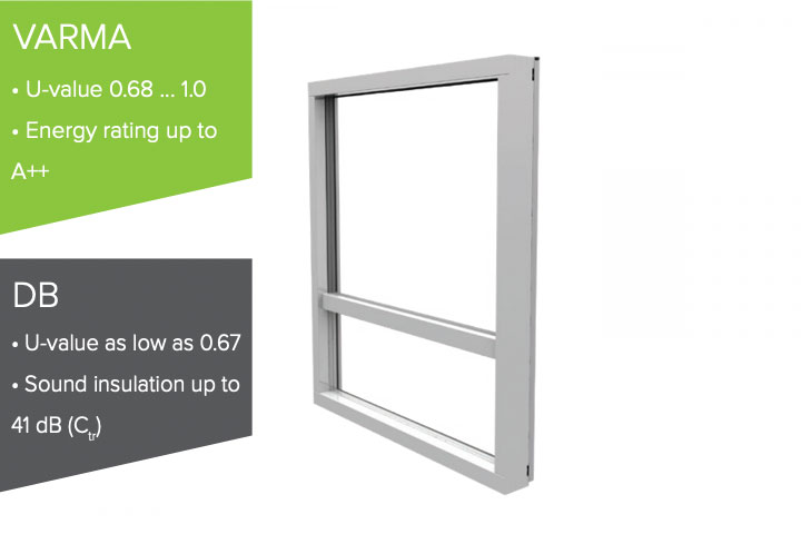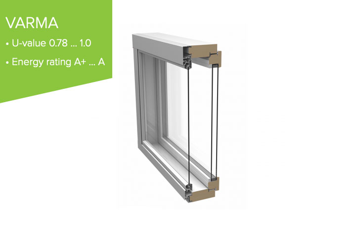 Pihla Varma är ett inåtgående trä-aluminiumfönster med två bågar och dubbelt isolerglas i innerbågen. Ytterbågen är av aluminium och har ett glas. Pihla Varma är ett pålitligt basfönster som passar till alla objekt. Om Varmas tillförlitlighet och hållbarhet vittnar det faktum att vi lämnar fönstret en rötskyddsgaranti på 25 år.